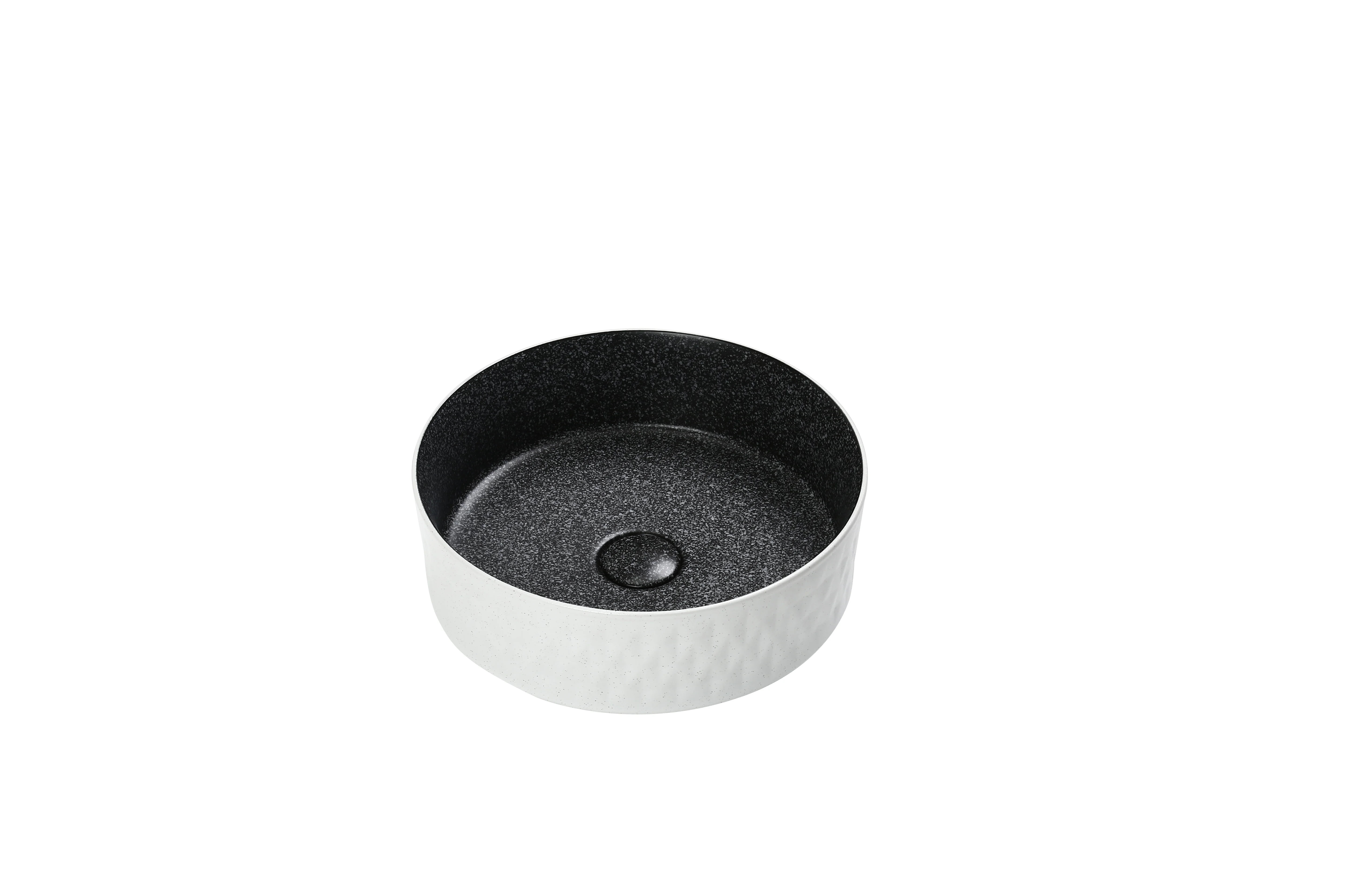 A sleek black speckled interior paired with a refined textured white exterior makes this basin a perfect centerpiece for modern bathrooms.