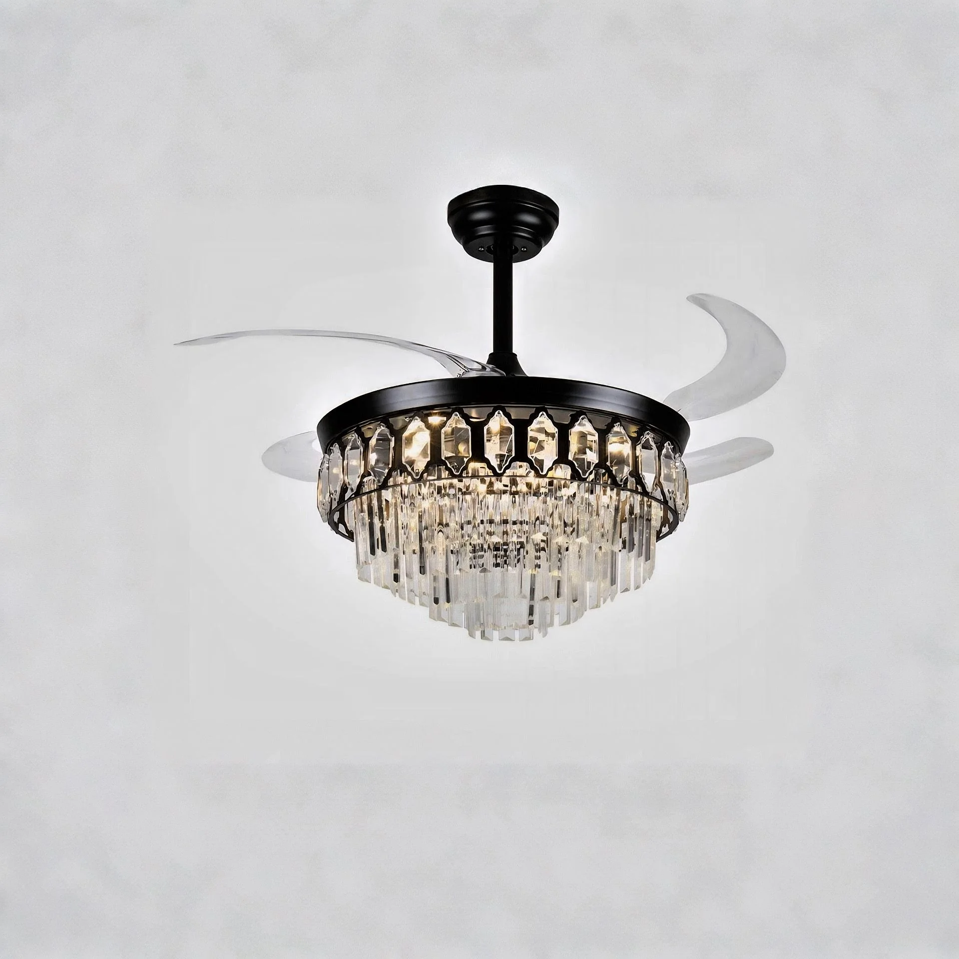 The innovative retractable blade design ensures a seamless transition between function and style. When in use, the transparent blades extend to deliver smooth, efficient airflow; when turned off, they retract effortlessly, leaving behind the refined silhouette of a luxurious chandelier.